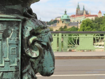 Kijk ook goed naar de versierde lantaarnpalen op de brug. Het wapen van Praag, een ramskop en mannen die waterkruiken dragen, niet zomaar een lantaarnpaal.