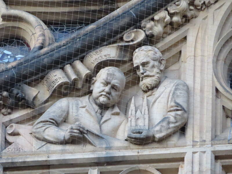 De architecten van het laatste deel van de Sint Vitus hebben zichzelf laten vereeuwigen in de voorkant van de kathedraal. Je ziet ze aan weerszijden boven de eerdergenoemde deuren.