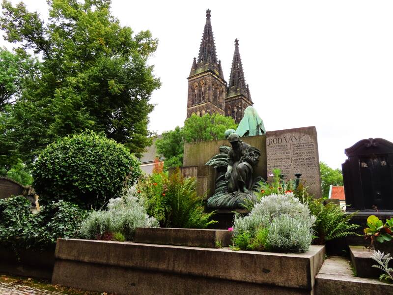 De begraafplaats van Vysehrad met erachter de Petrus en Pauluskerk