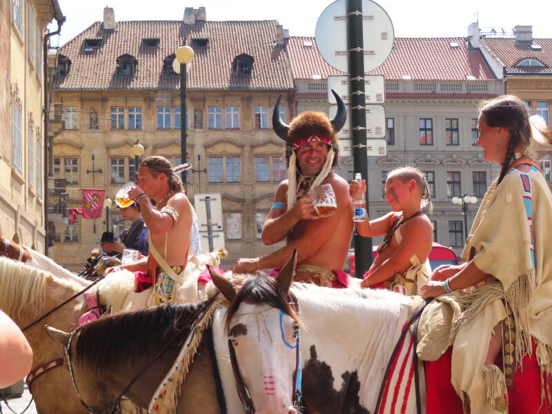 Een van de verklede dames vraag ik wat het idee is van deze verkleedpartij. Ze roept iets in onverstaanbaar Engels over een memorial van een generaal. Via mijn Amerikaanse Praagse vriend begrijp ik later dat het te maken had met generaal Custer, het bekendst van zijn nederlaag en dood in de Slag bij de Little Bighorn in 1876, waar hij met zijn leger verpletterd werd door een coalitie van indiaanse stammen onder leiding van Sitting Bull en Crazy Horse. Maar dat gebeurde niet in augustus, maar in juni, dus waarom ze vandaag zich hebben uitgedost blijft me een raadsel.