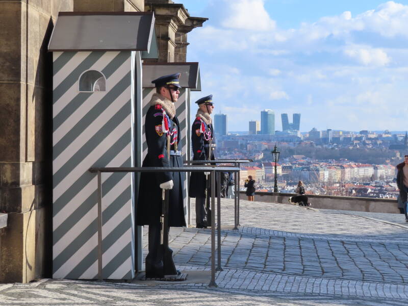 Heb je de Praagse Burcht gezien en loop je onder de Matthias Poort door, dan zie je twee kasteelwachters voor hun wachthokje staan. Altijd leuk voor een foto.