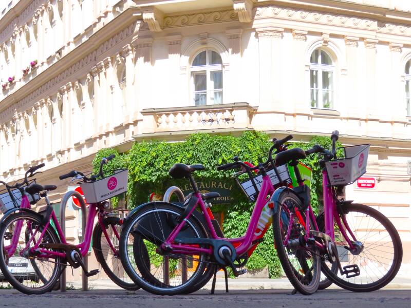 Fietsen in Praag is een sportieve uitdaging. Tot nu toe was het huren van een fiets niet in mijn hoofd opgekomen. Praag is een wandelstad en voor de langere stukken pak je gemakkelijk de tram of de metro. In de historische binnenstad lijkt het (overdag) vrijwel onmogelijk om te fietsen, door de vele toeristen en de hobbelige kasseien. Dat wilde ik wel eens ervaren. Als wandelaar en hobbyfotograaf behoort fietsen niet tot mijn directe hobby's, al is het maar omdat je fietsend moeizaam een mooie foto kunt maken zonder gevaar voor eigen leven.