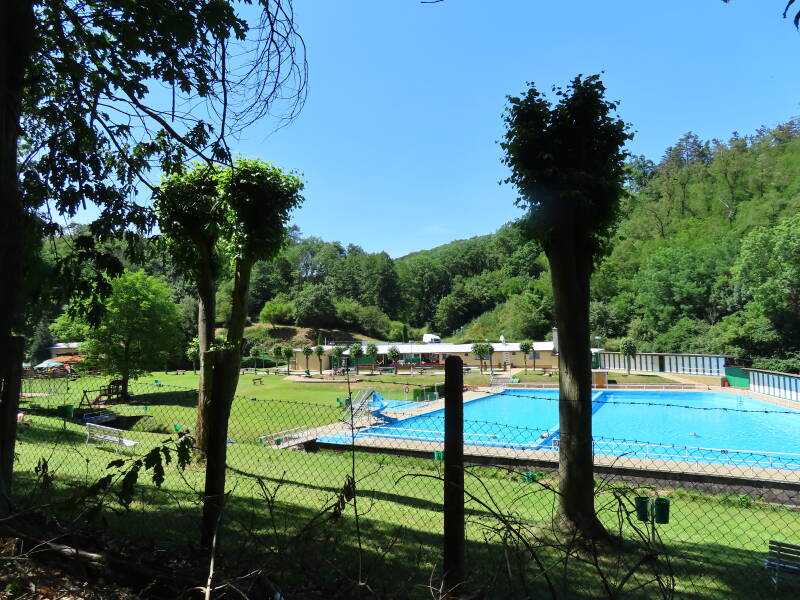 Het zwembad, dat je op de foto in de vallei ziet liggen, is buiten de vakanties om heel rustig. Toen we erlangs liepen, waren er ongeveer vijf bezoekers en we hadden spijt dat we geen zwemspullen mee hadden genomen. Als je in de buurt bent en het is zomers warm, neem je spullen mee. Het is tien minuten lopen vanaf de tramhalte bij de McDonalds of je fietst erheen.