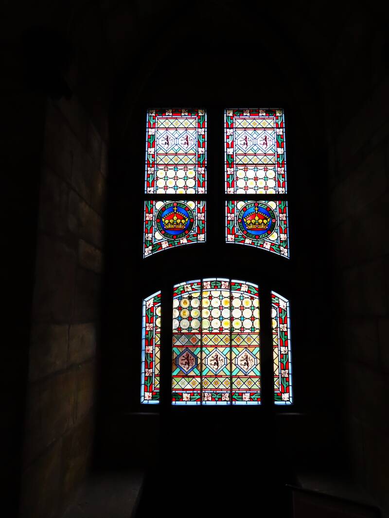 De gekleurde glas-in-lood ramen halen niet niet bij het glas-in-lood van de Sint Vituskathedraal, maar geven de verder kleurloze ruimte enig aanzien. Ik loop door naar boven en via enkele houten trappen en een poging tot een tentoonstelling over beelden kom ik bij het deurtje naar de balustrade.