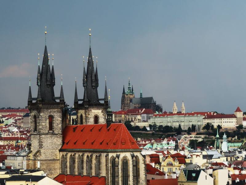 De regen slaat inmiddels hard tegen de kasseien, zoals het een zomerse bui betaamd. In mijn korte broek en t-shirt gaat het een natte bedoening worden. Hier blijven staan kan, maar is een saaie optie. Ik kies voor een intervaltraining en ren van afdakje naar afdakje terug naar het Oude Stadsplein. Op een paar druppels na eindig ik enkele minuten later samen met een groepje scholieren droog onder de gewelven van restaurant U Tyna, vlak voor de Tyn-kerk. Het uitzicht is prima.