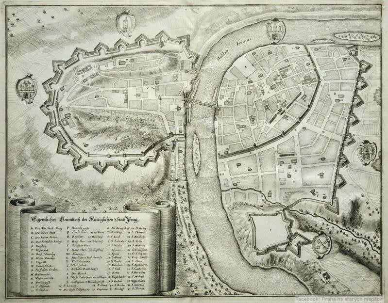 Kaart uit 1650 met Hradcany en Mala Strana (links), Stare Mesto (midden), Nove Mesto (rechts) en Vysehrad (onder)